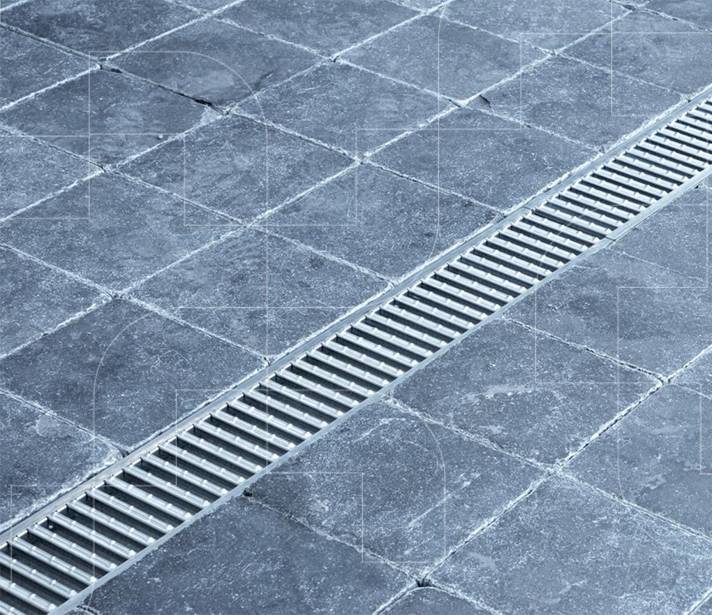 Opliggend, vastliggend sleufrooster uit thermisch verzinkt staal. Het rooster is genormeerd voor belastingsklasse A 15 kN conform DIN/NBN EN 1433.