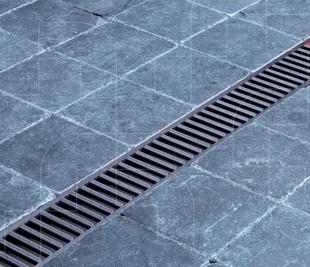 Opliggend, vastliggend sleufrooster uit thermisch verzinkt staal, antraciet gepoederlakt. De oppervlakte van de duurzame coating kan omschreven worden als mat met ruwe textuur. De ruwe textuur maakt dat de roosters nog meer krasbestendig zijn. Het rooster is genormeerd voor belastingsklasse A 15 kN conform DIN/NBN EN 1433.