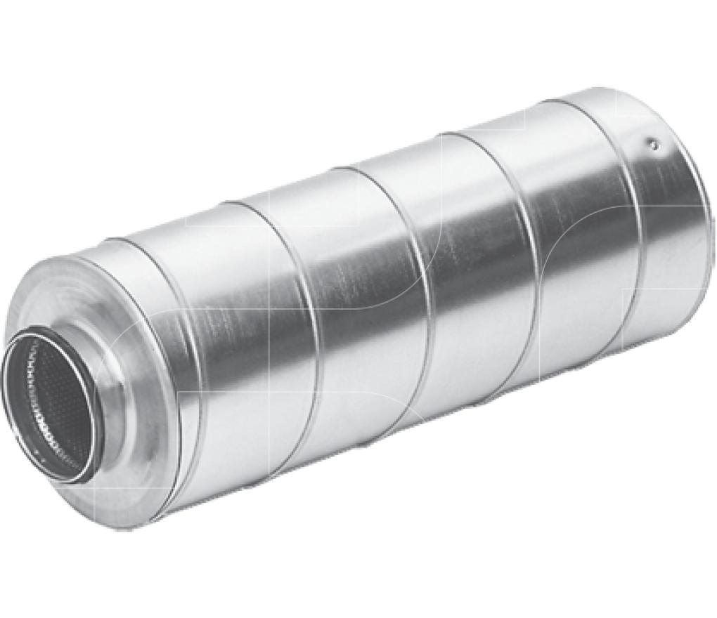 Starre ronde geluidsdemper bestaande uit een uitwendige spiraalbuis met een geperforeerde binnenmantel.