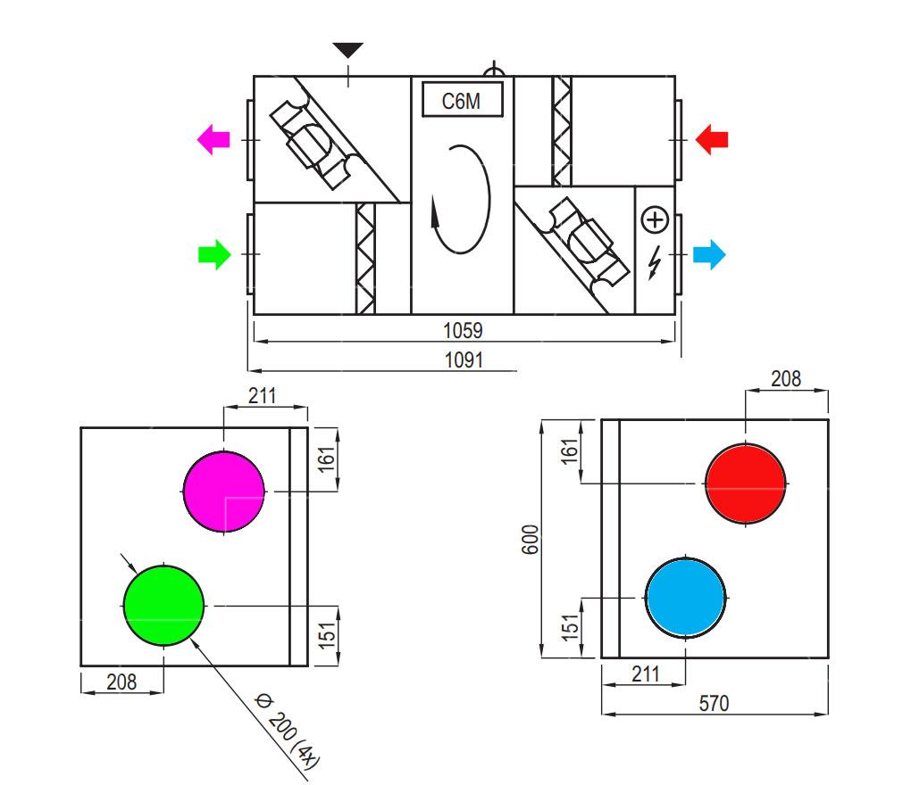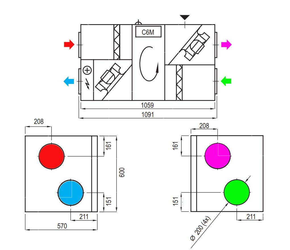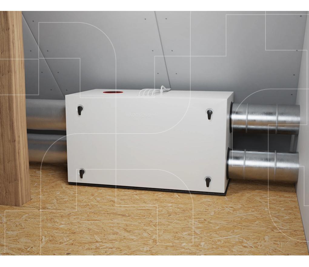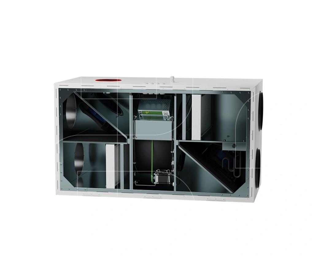 Compacte ventilatie-unit met zijaansluiting in industriële bouwkwaliteit.