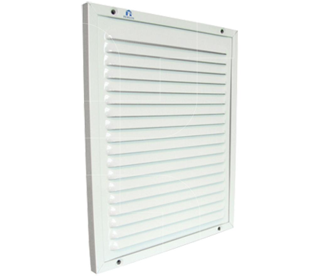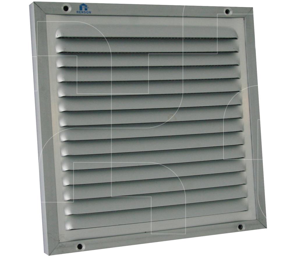 Aluminium schoepenrooster met kader en muggengaas voor diverse toepassingen zoals toevoer-, doorvoer- en afvoermogelijkheden, montage met schroeven en pluggen.