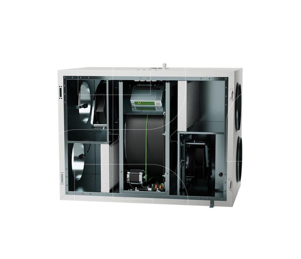 Compacte ventilatie-unit met zijaansluitingen in industriële bouwkwaliteit en voorzien van een warmtewiel.