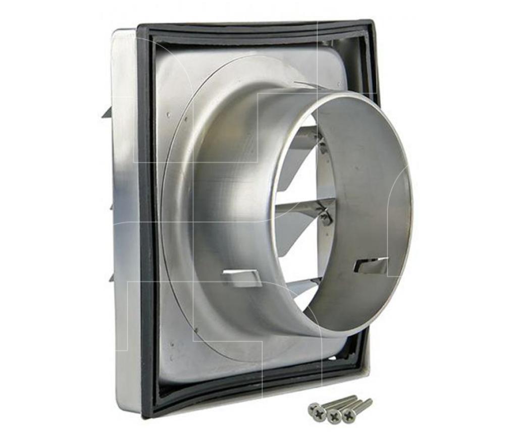 Inox dampkaprooster voor de afvoer van lucht in een buitenmuur. Het rooster wordt eenvoudig in de buis geklikt en vervolgens stevig aan de muur bevestigd met schroeven.