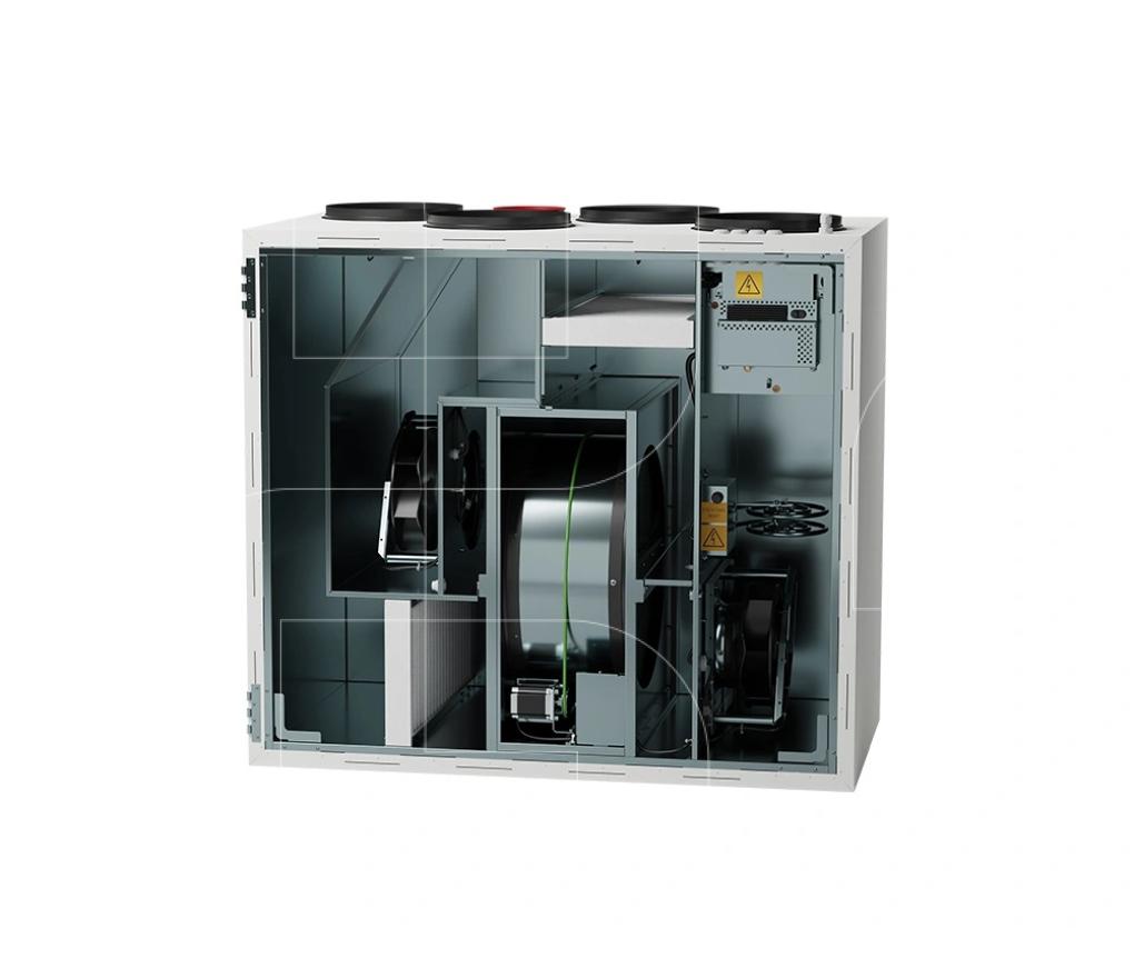 Compacte ventilatie-unit met bovenaansluitingen in industriële bouwkwaliteit en voorzien van een warmtewiel.