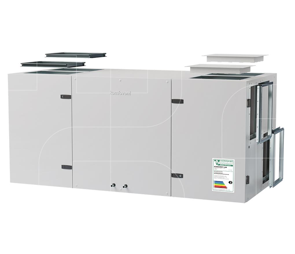 Industriële ventilatie-unit met boven- of zij-aansluitingen uitgerust met een tegenstroom warmtewisselaar.
