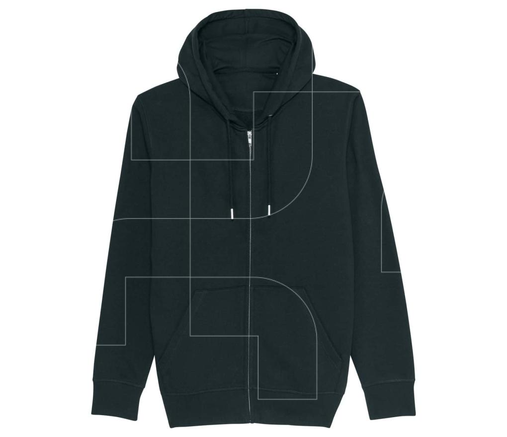 - Sluiting en zakken: Ritssluiting (bedekt) + twee touwtjes aan de nek + kap + buidelzak aan de buik met ritsverdeling