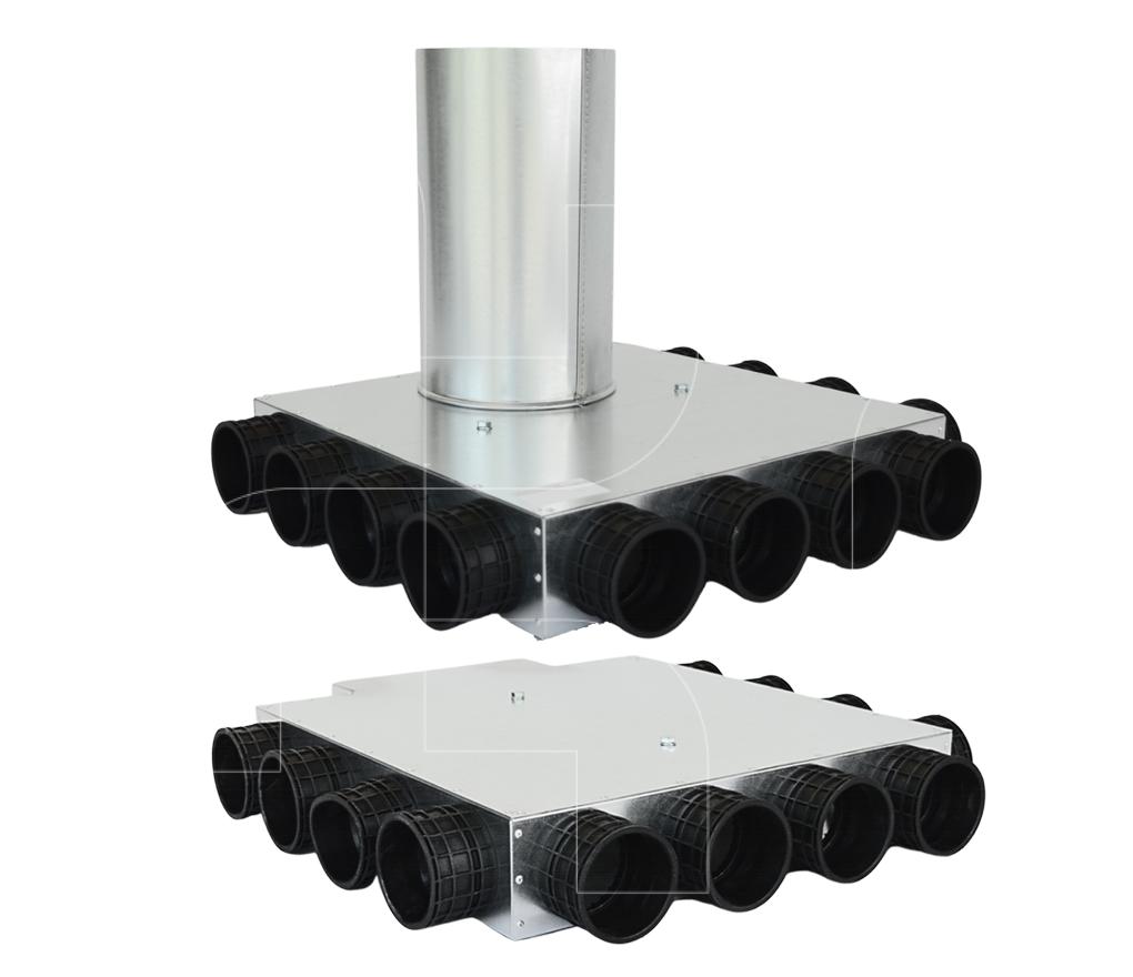 Deze hoofdcollector met 12 aansluitingen vormen de kern van een innovatief en volledig hybride luchtverdeelsysteem, voor een snelle, veilige en duurzame aansluiting van flexibele luchtkanalen in Ø 63 mm.