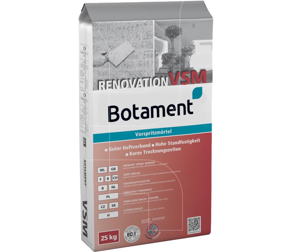 RENOVATION VSM is een dampdoorlatende voorspuitmortel voor binnen en buiten. Dient als hechtbrug voor RENOVATION FSP speciaal vochtpleister. Kan ook worden gebruikt voor het opvullen van metselwerkvoegen en het egaliseren van ongelijke ondergronden.