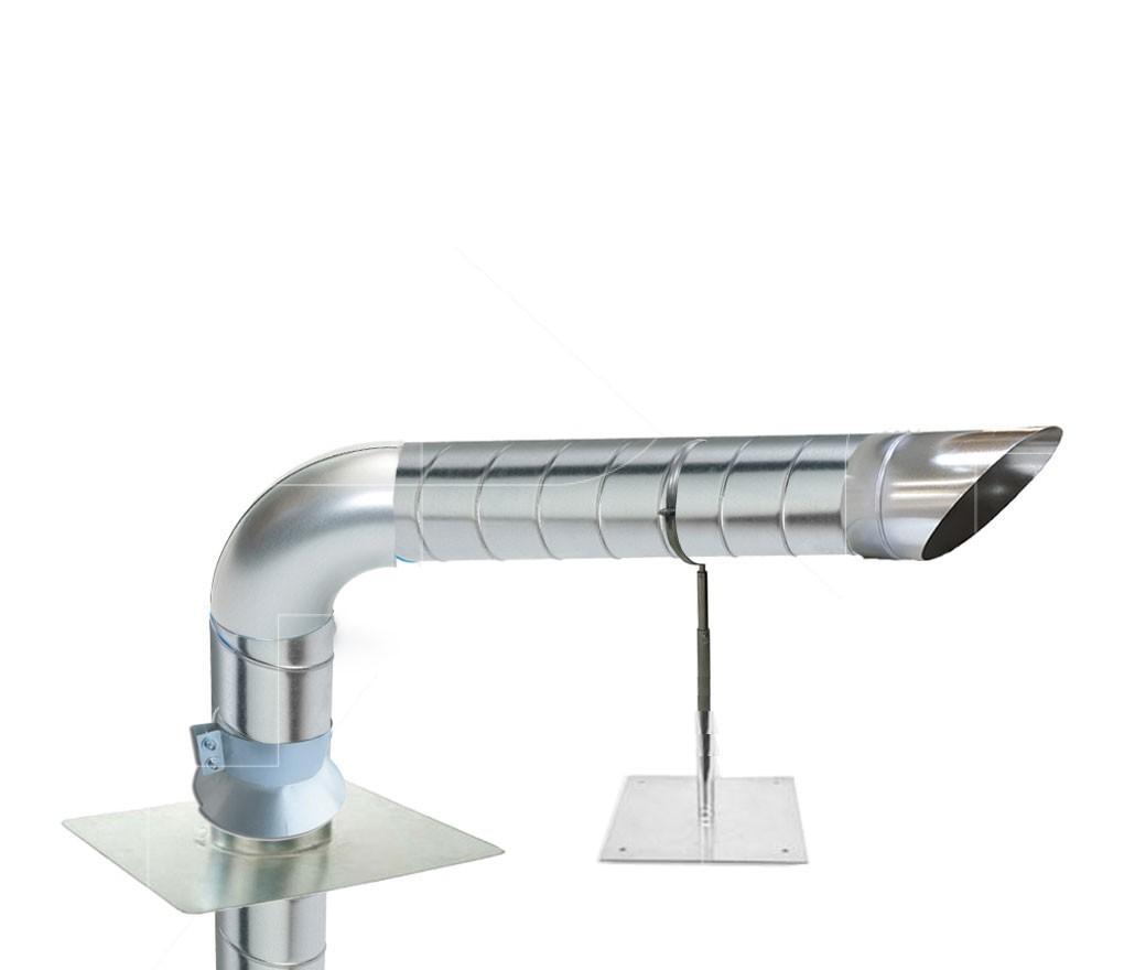 Om de in- en uitblaas bovendaks uit elkaar te brengen, wordt de schuin uitblaas met een galva buis verlengd. Deze wordt ondersteund door de voetsteun welke bevestigd wordt op ballast of verankerd is.