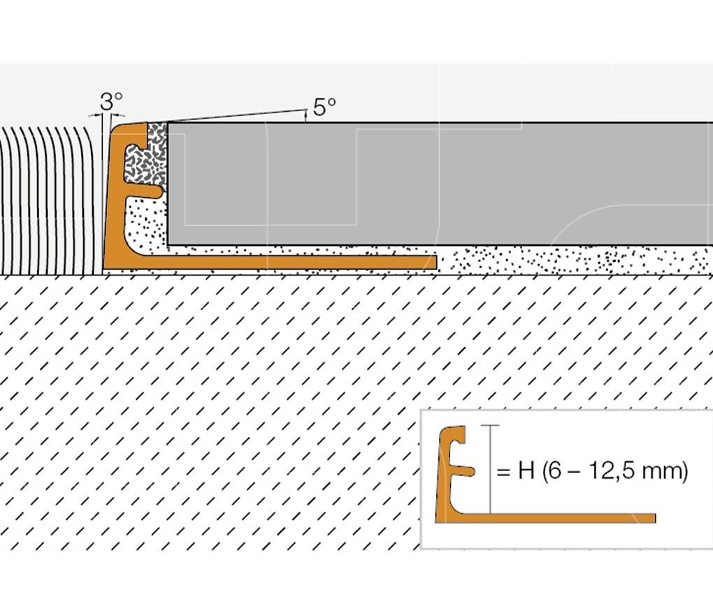 SCHIENE-AE is een decoratief profiel onder een hoek van 87° uit geanodiseerd aluminium voor uitwendige hoeken in wandbekledingen, plinttegels en andere begrenzingen. De tegelkanten worden beschermd tegen mechanische beschadiging.