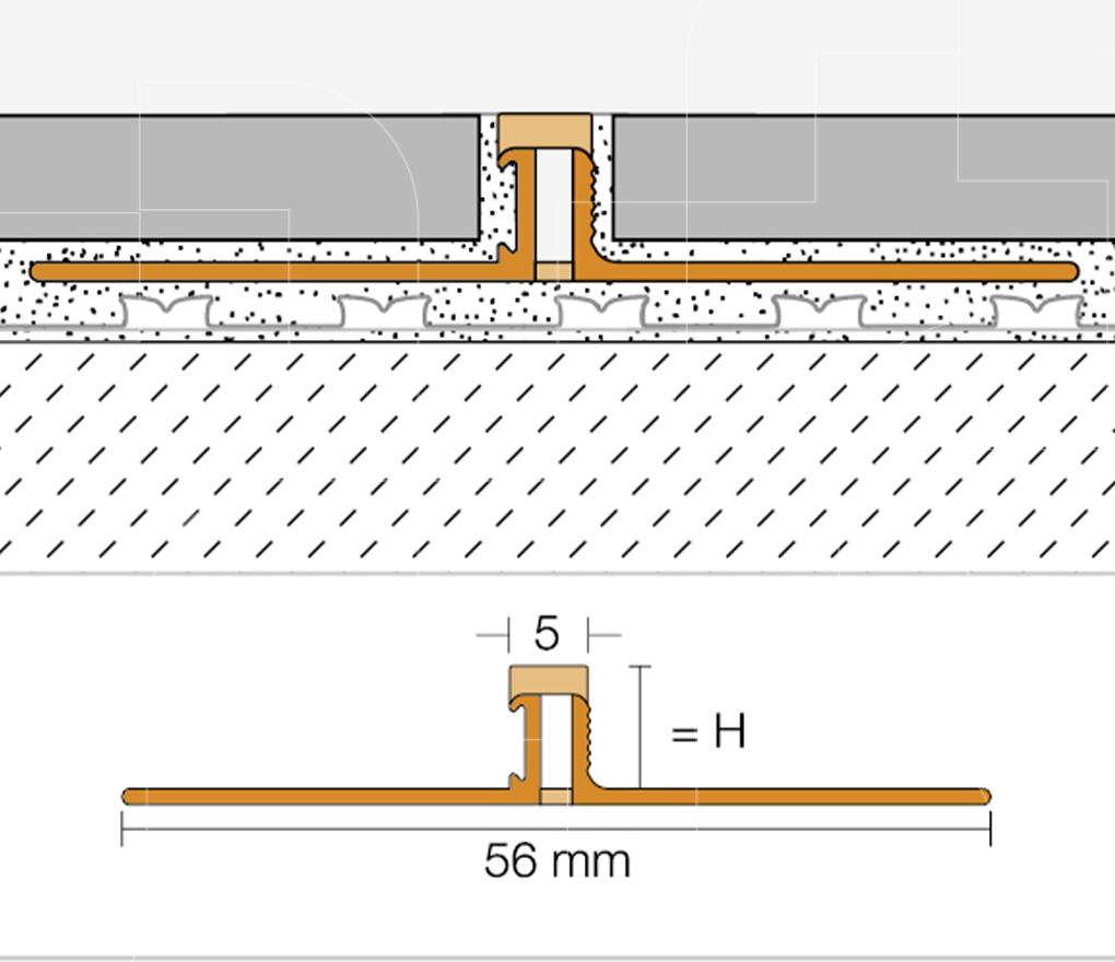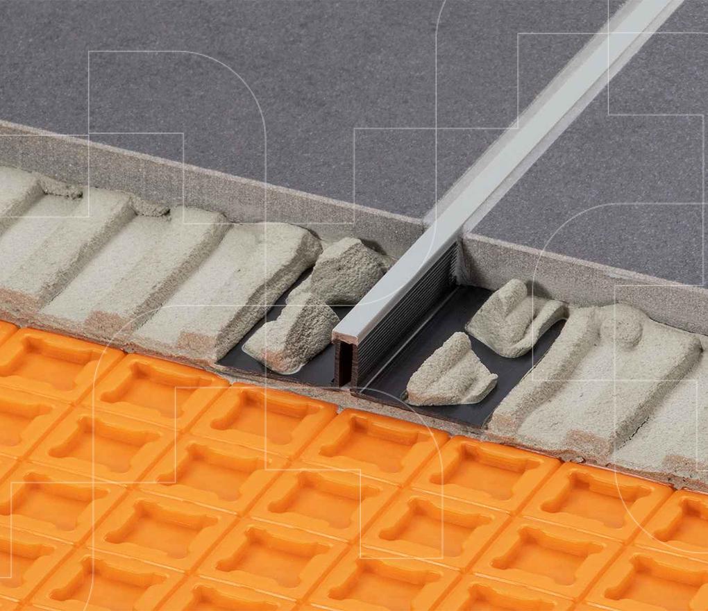 De zijdelingse trapeziumvormig geperforeerde bevestigingsvlakken uit hard-PVC-regeneraat verankeren zich onder de tegels in de tegellijm en leiden de bewegingen af naar de bewegingszone.