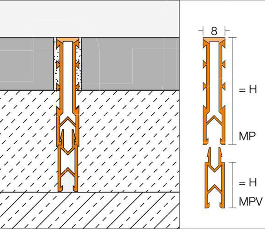 DILEX-MP is een uitzettingsvoegprofiel met zijdelen met opengewerkte hechtstructuren van hard pvc-regeneraat en een bewegingszone die de zijdelen overdekt van zachte kunststof met profiel ophoogstukken voor plaatsing in mortel.