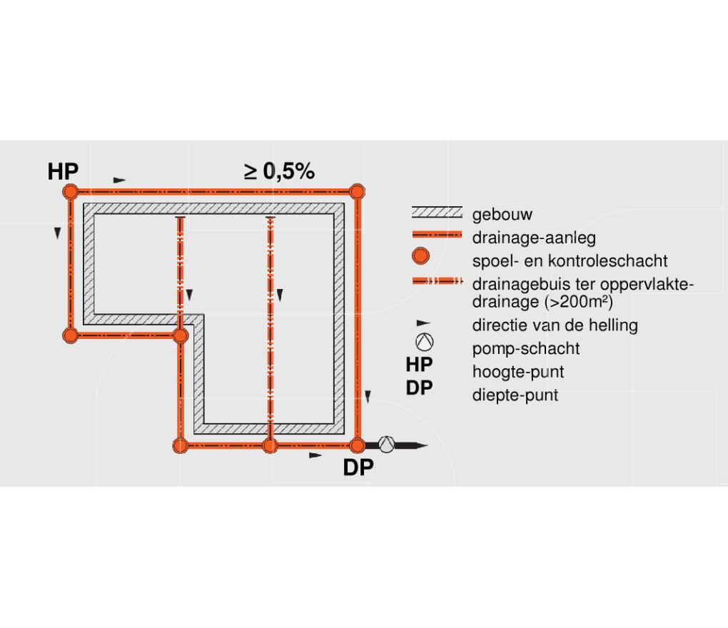 De drainageleiding moet als gesloten, rechtlijnige ringdrainage aan alle plaatsen een minimale en regelmatige helling van 0,5% hebben.