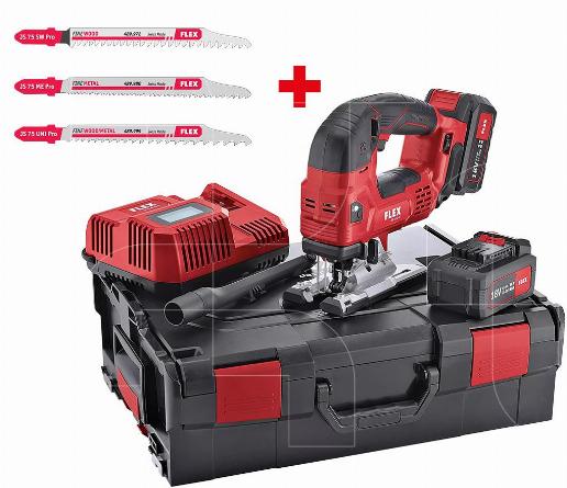 Voordeelset met 18,0V accu-decoupeerzaag beugelgreep met 2x Li-Ion oplaadbare accupacks + snellader en gratis decoupeerzaagbladen assortiment voor hout, metaal, demontage.